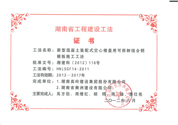 湖南省2011年度省級工法證書