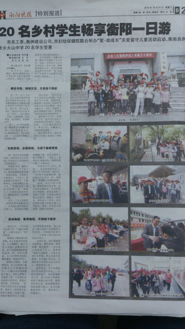 10月27日,由市關工委牽頭組織、我司承辦的關愛留守兒童愛心活動在衡陽市婦幼保健院舉行,活動組織了來自衡南縣的20留守兒童代表參加,我司向這些留守兒童捐贈了書包、字典等文具,中午安排他們在肯德基就餐,餐后帶領他們先后游覽了衡陽市動物園、衡陽市博物館,最后到達我司承建的石鼓公安分局業(yè)務用房項目參觀。