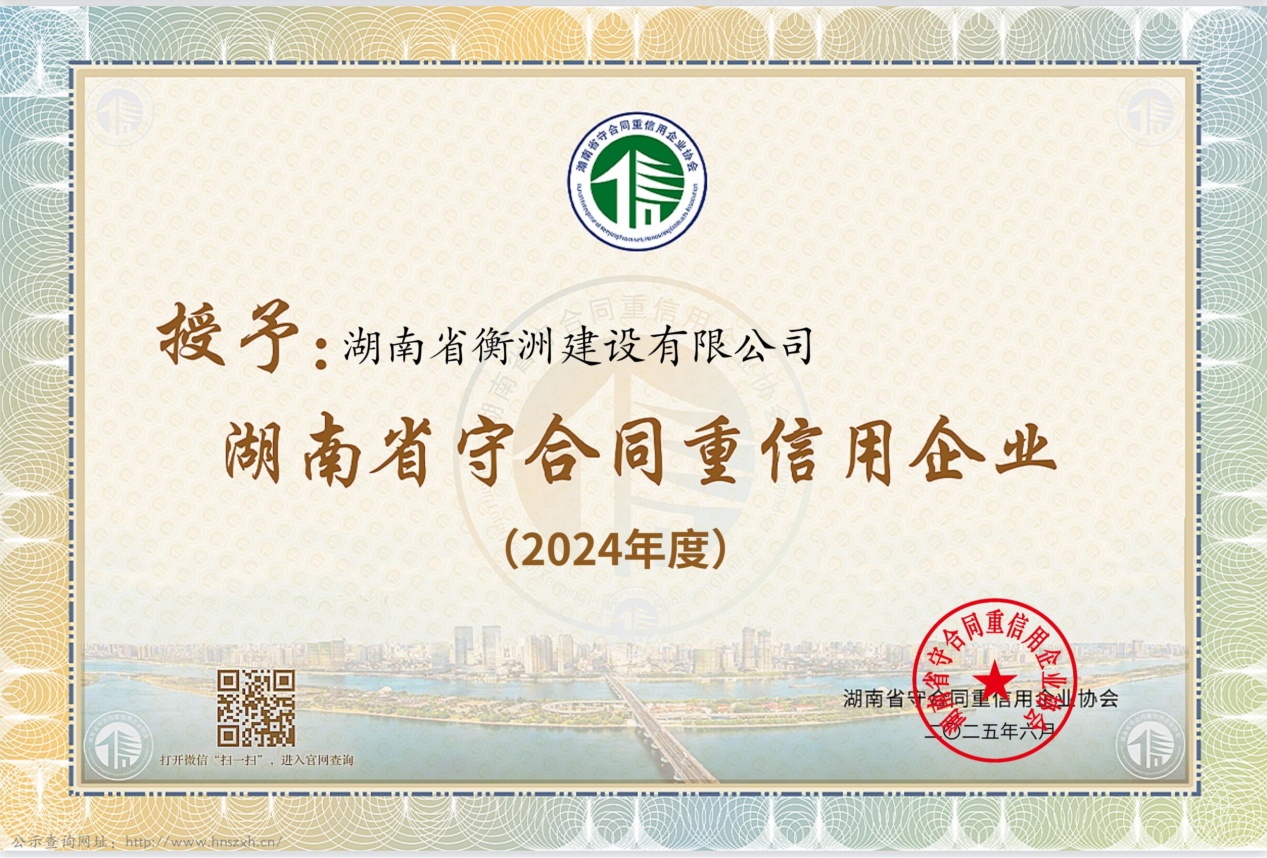 近日,湖南省守合同重信用協(xié)會(huì)正式公布 2024 年度 “湖南省守合同重信用企業(yè)” 名單,湖南省衡洲建設(shè)有限公司憑借卓越的信用管理水平與良好的市場(chǎng)信譽(yù)再度登榜。這是衡洲建設(shè)自1999年以來,第24次獲得湖南省“守合同重信用企業(yè)”殊榮。